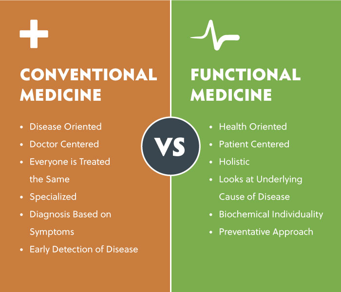Functional health and conventional medicine differ in their approaches to treatment. While conventional medicine tends to rely on medications and surgeries to manage symptoms, functional health seeks to identify and address the underlying imbalances that contribute to illness. Functional health practitioners often emphasize the importance of lifestyle modifications, such as diet and exercise, in promoting long-term health and wellness.